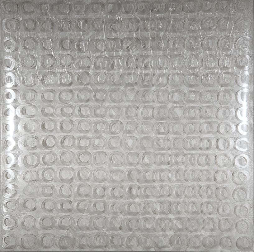 Senza titolo, acrilico, carta e plastica su tela, 90 x 90 cm, 2012-13.